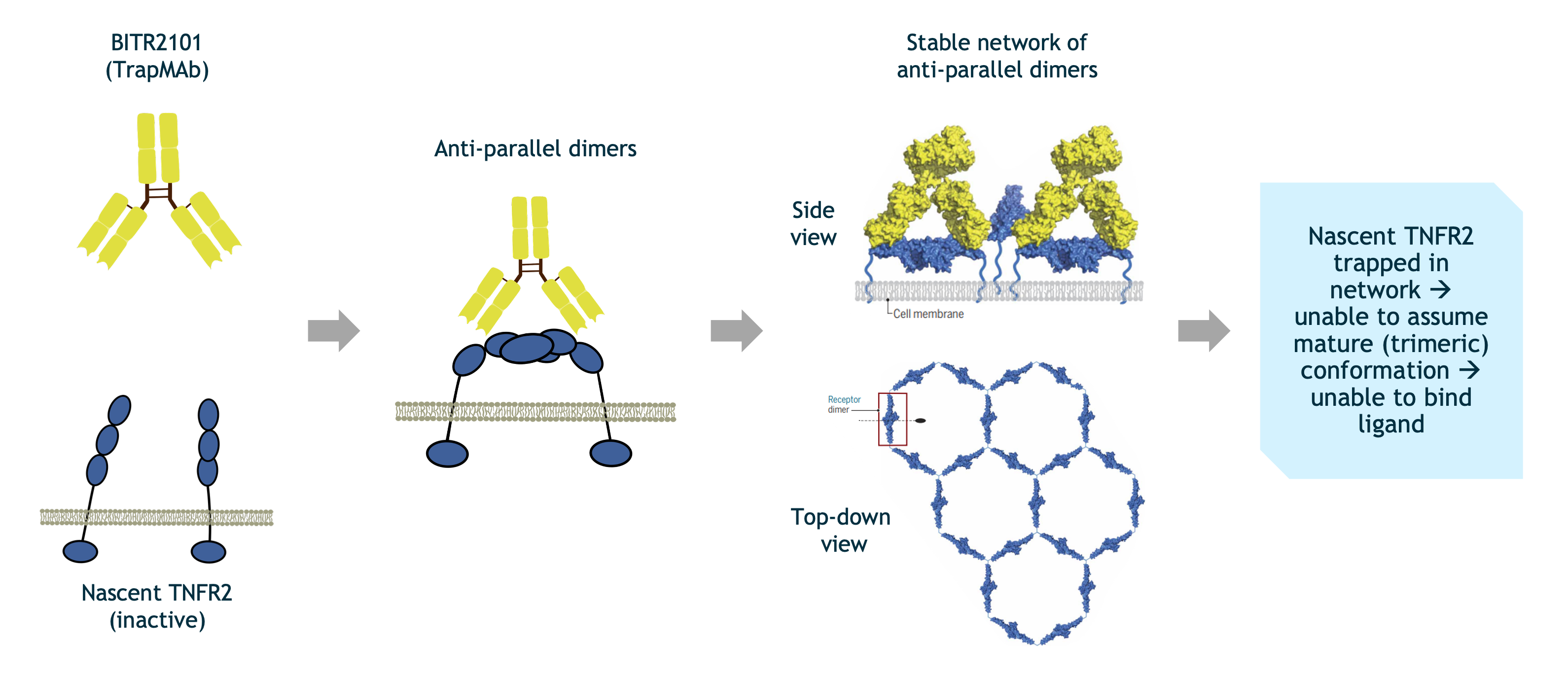 BITT’s proprietary TrapMAb monoclonal antibodies target the tumor necrosis factor receptor (TNFR) superfamily via a unique mechanism: they trap nascent TNFR molecules in an inactive hexagonal network.